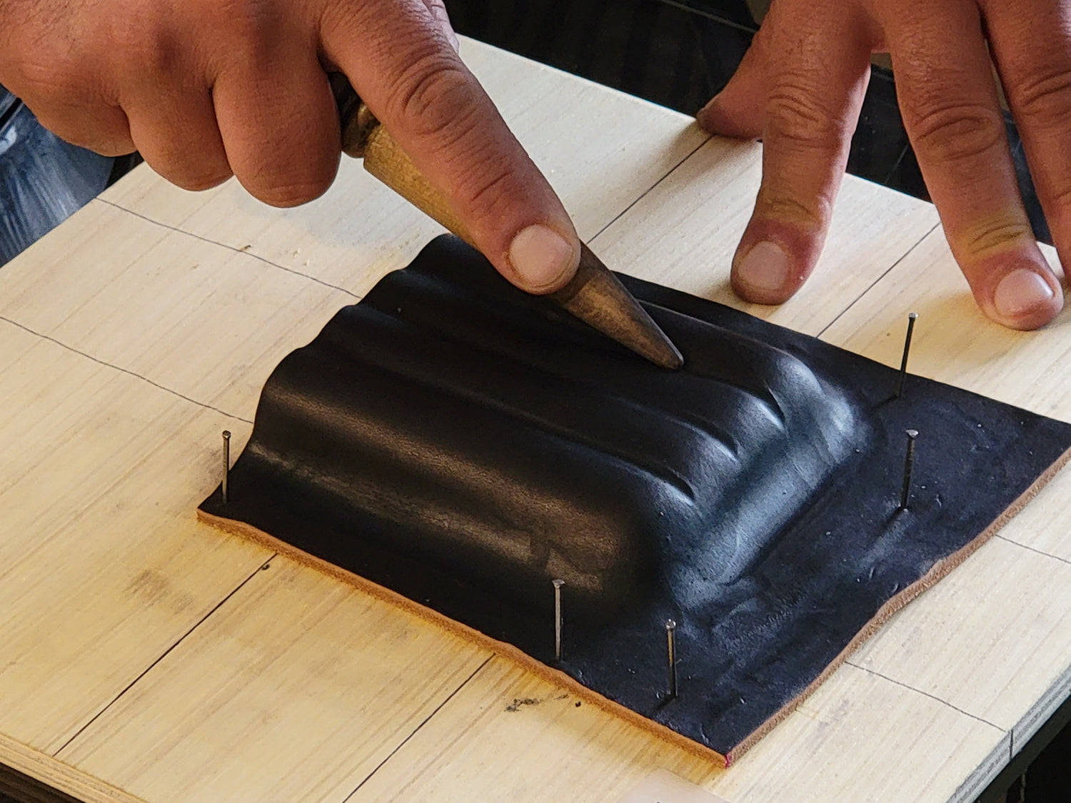 Our products are built to last. Once the leather is cut and shaped, it is then glued it together. Once front and back are pieced together, we use our tools to create tiny holes that will be used to sew the two pieces together with a reinforced thread.